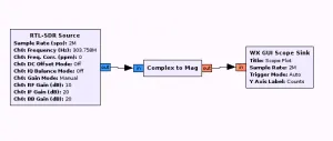 On the back I located the FCC ID and did a search on it over at the FCC’s .gov website. With this all that I looked at was the operating frequency which turned out to be 303.758MHz, well within range of my receiver. From here I tuned to the frequency and came up with a little GRC Flow Graph to run so I could visualize it.