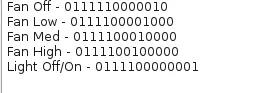 Note: As you can see the first row and the last row contain the same command but different ID, this is because I pressed the same button for each, but the DIP switches were in different positions (to select a different fan).