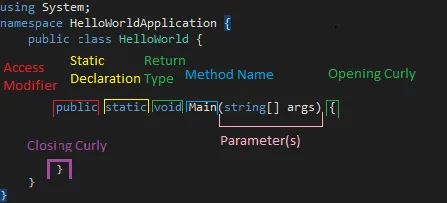 On line 6 you can see a call to Console.WriteLine(“Hello World”). What this is doing is calling the static class “Console” and calling the static method within this class called WriteLine. Along with this we are passing in a string as a parameter.