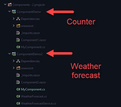 Now it’s time to pull out the demo components and see what we can do! I started by pulling the WeatherForecast and Counter components out into their own assemblies. These were just simple Razor Class Libraries (RCLs) targeting .netcoreapp3.1
